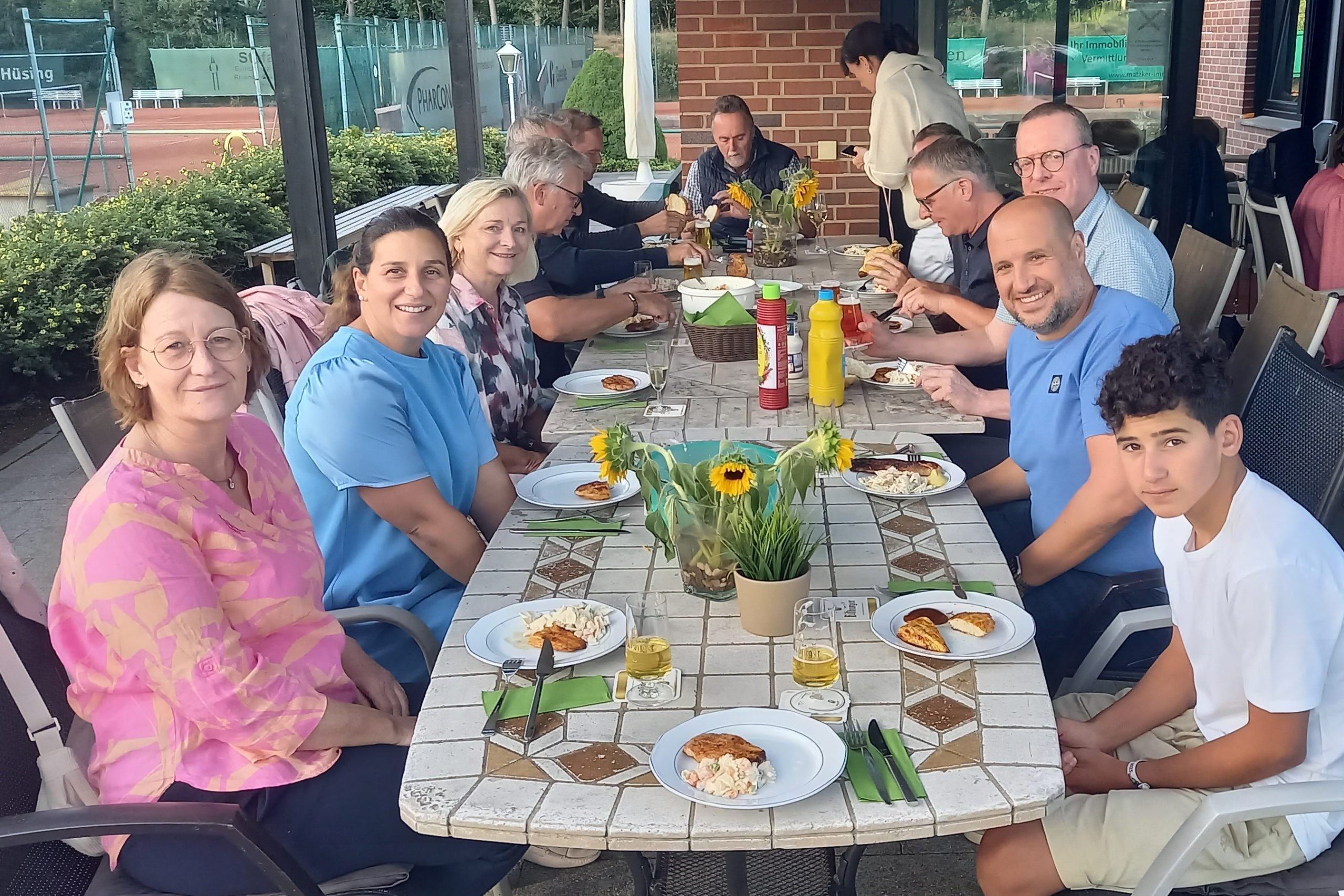 Der Thekendienst – ein großes Dankeschön gilt hier Alex Renger, Alex Terhardt und Maxi Müller – hatte zwischenzeitlich bereits die Tafel auf der Terrasse eingedeckt und den Grill angeschmissen, so dass man zügig mit dem Grillen weitermachen konnte. Die Steaks und Würstchen der Fleischerei Ende sowie die Salate von Christa und Christian Tiltmann kamen super an und wurden fast komplett verputzt.