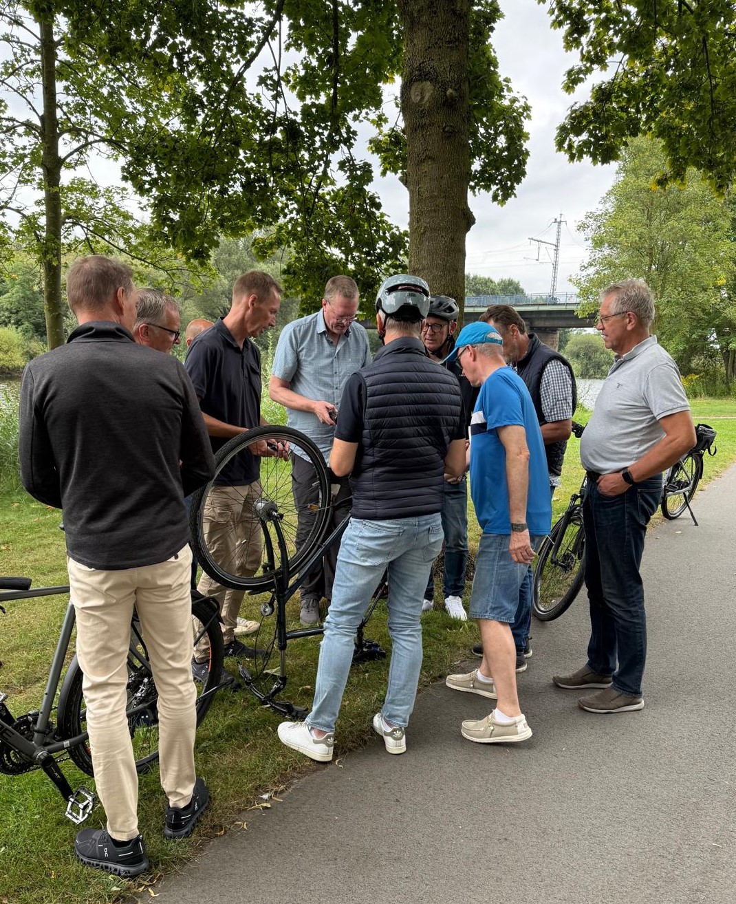 Die eigentlich 45-minütige Radtour von Mesum nach Rheine wurde durch einen planmäßigen und zwei unplanmäßige Stopps etwas verlängert. Eine fiese „Cocktail-Soßen-Spritz-Attacke“ zog eine kurze Reinigungspause des Outfits bei einer Teilnehmerin nach sich. Und nach der planmäßigen Bierpause an der Ems hatte ein Dorn im Reifen den High-Tech-Drahtesel von Charly Beuvinck außer Gefecht gesetzt. Aber dank mitgeführtem Reparatur-Schaum konnte die Fahrt schnell fortgesetzt werden, und um 14.30 Uhr trafen die Mesumer beim TC Union Rheine ein, wo bereits 6 weitere 64-Freunde-Club-Mitglieder auf die Radgemeinschaft warteten.
